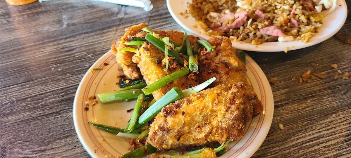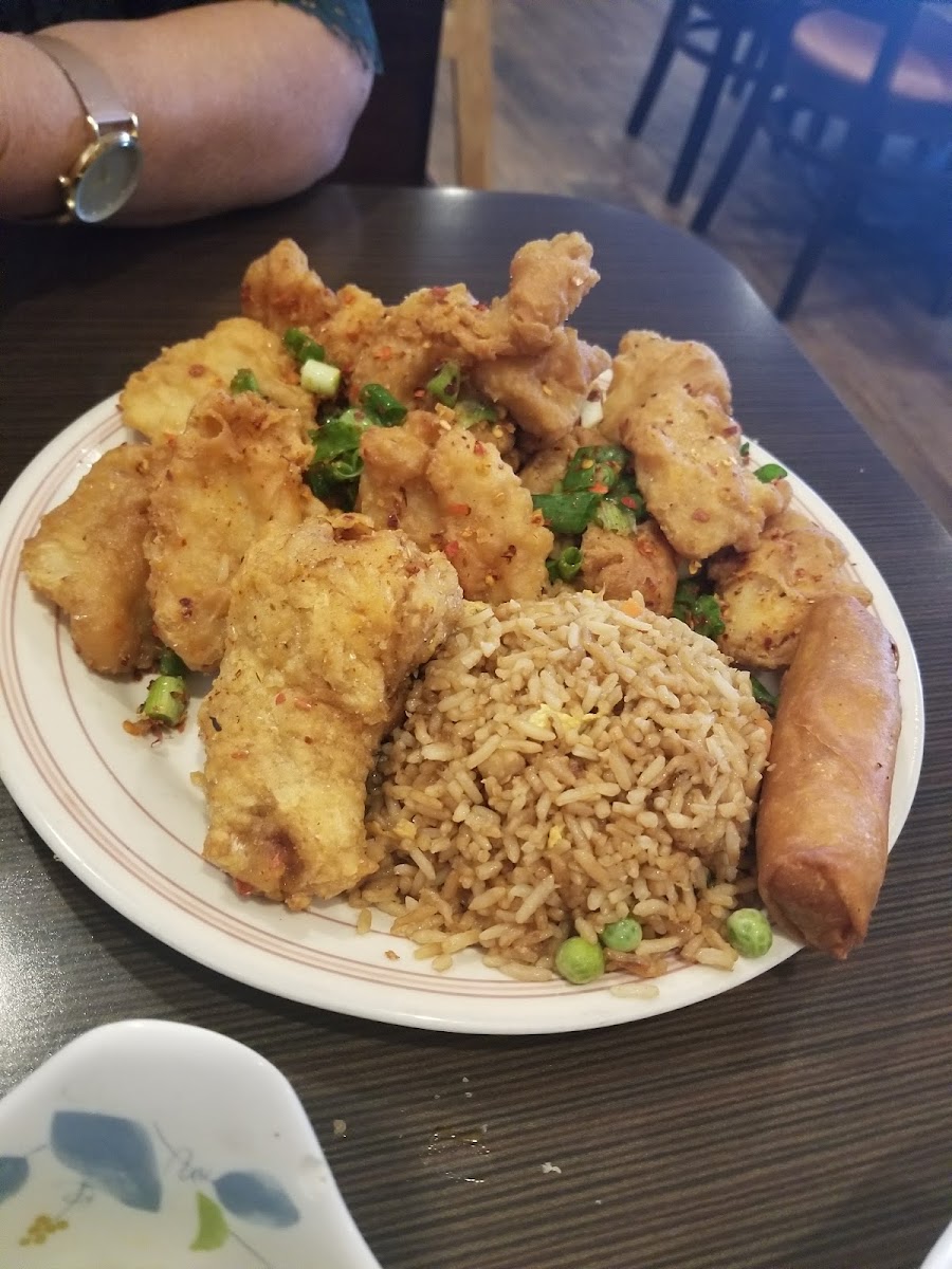 First time here and had 2 combination meals. One of BBQ pork and the other salt &,pepper shrimp. Plate comes with one vegetable spring roll, 2 chicken wings (salt peppered) and fried rice. Food was good and as expected. It was a good experience to dine here. Service was attentive.It is inside a shopping plaza so plenty of parking space. Notice many huge take out orders.